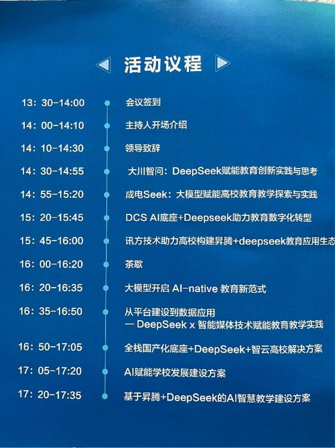 这次研讨会的主题是:AI算力底座与大模型赋能教育场景创新,主要内容包括四川高校智能教育实践案例分享、昇腾 AI+DeepSeek 教育解决方案主题演讲、DeepSeek、智谱等大模型在教育场景应用展示与研讨等三大模块,同时,十多家川内外教育信息化企业在会场周围布置了大量展台,动态形象地展示了他们对于AI赋能教育创新落地化的系列化产品。